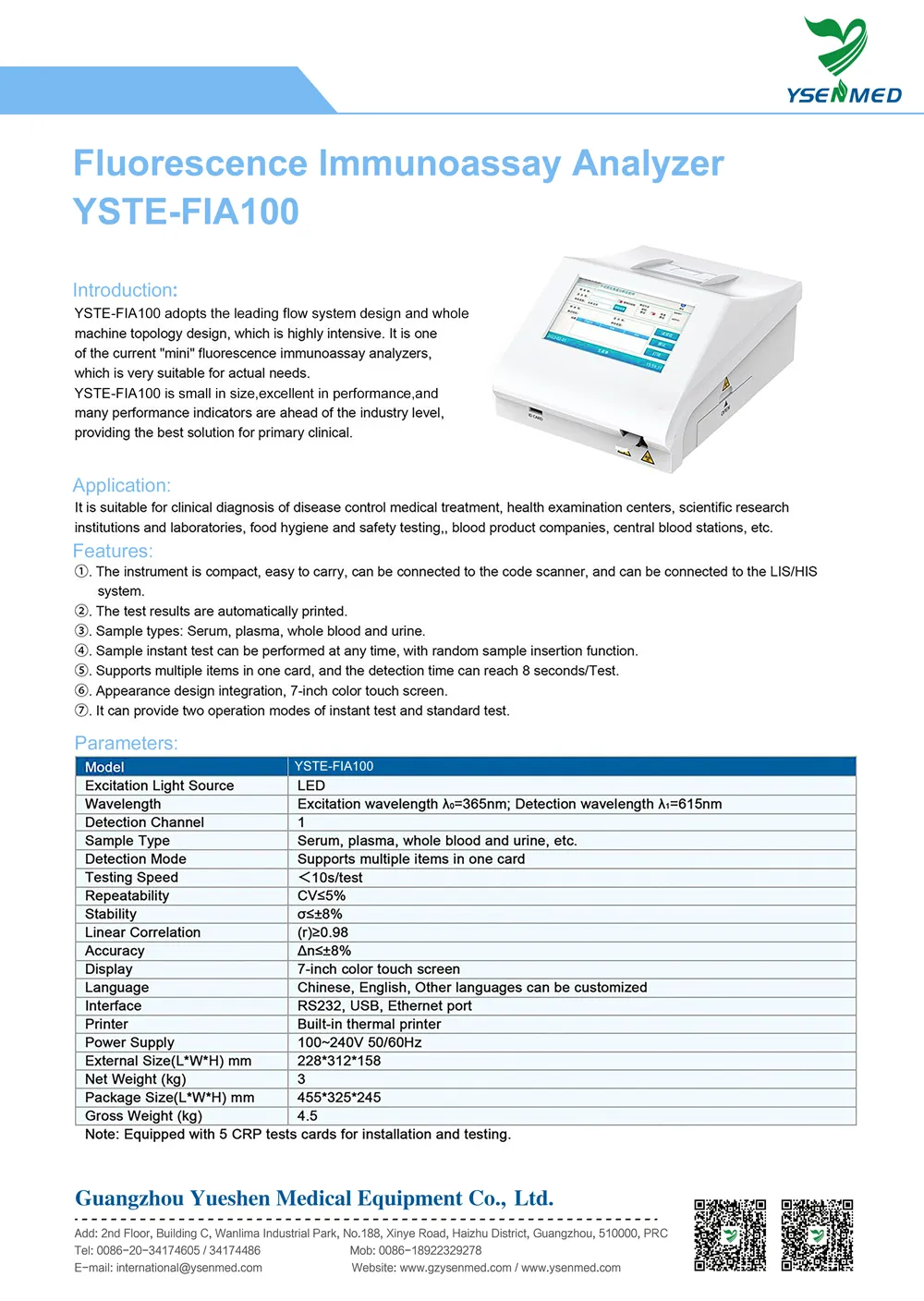 YSTE-FIA100 adopts the leading flow system design and whole machine topology design, which is highly intensive. It is one of the current "mini" fluorescence immunoassay analyzers, which is very suitable for actual needs. YSTE-FIA100 is small in size, excellent in performance, and many performance indicators are ahead of the industry level, providing the best solution for primary clinical.