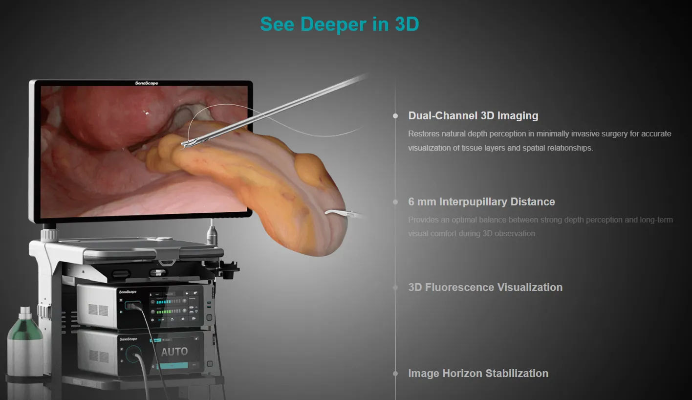 SonoScape SV-M4K220: Advanced 4K 3D NIR Endoscopy System. Enhancing surgical precision with real-time fluorescence & smart workflow.
